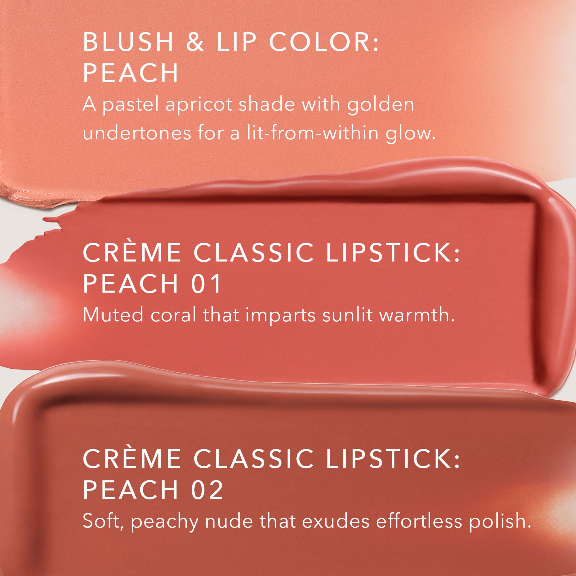 Peach: A pastel apricot shade with golden undertones for a lit-from-within glow.*